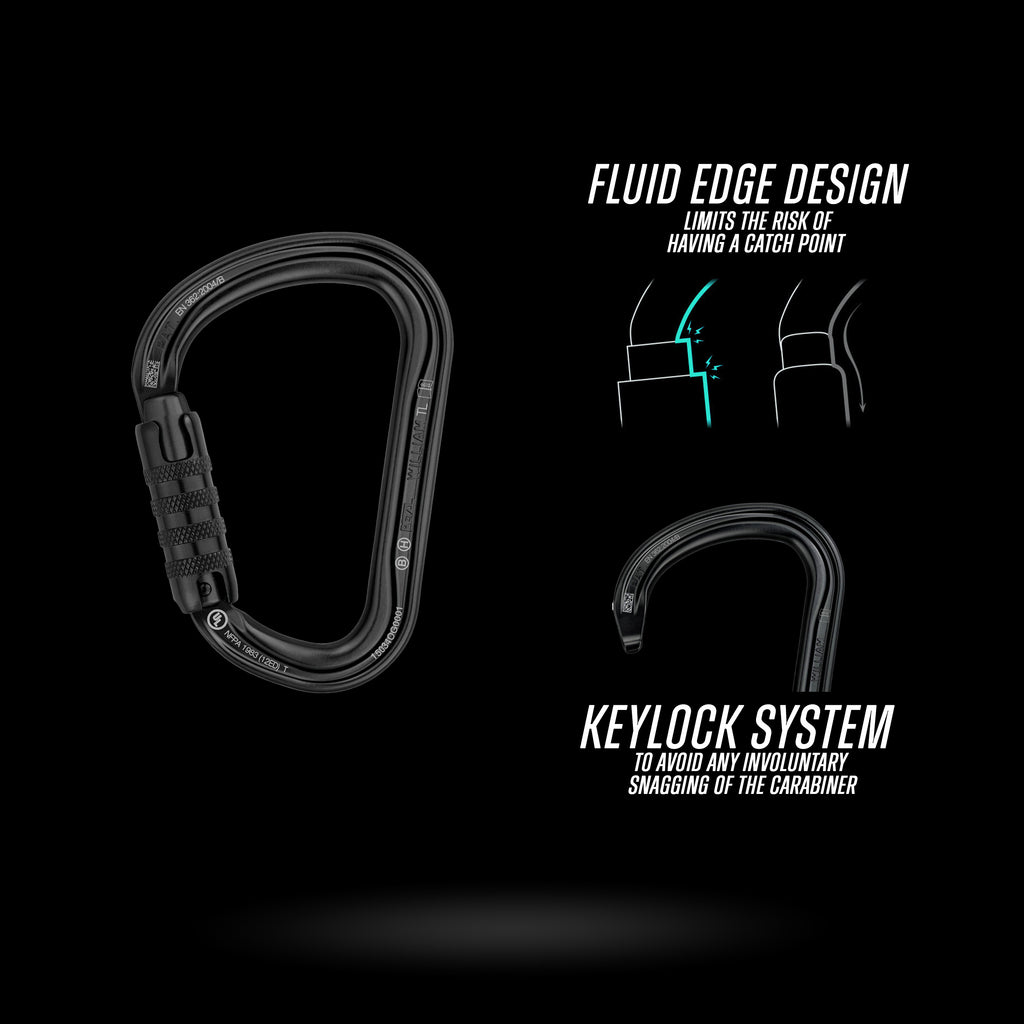 The lightweight WILLIAM large-capacity asymmetrical carabiner is made of aluminum. It has a pear shape that is practical for easily connecting multiple items. Its fluid interior design and Keylock system facilitate handling. The WILLIAM carabiner is available in two locking systems: manual SCREW-LOCK system or automatic TRIACT-LOCK system.