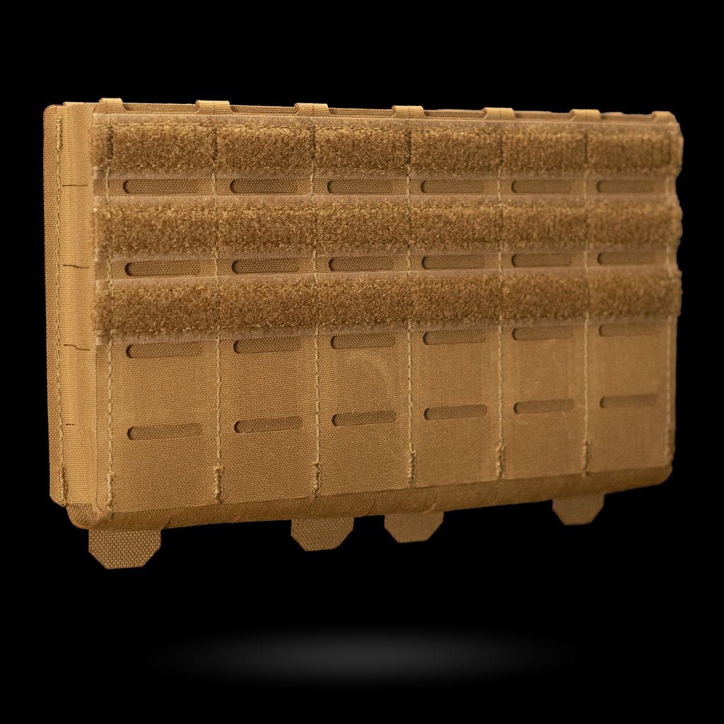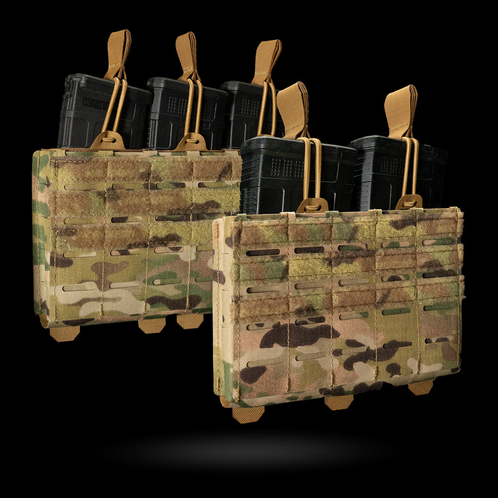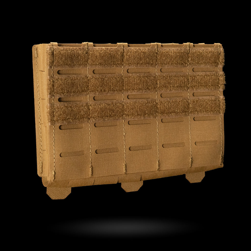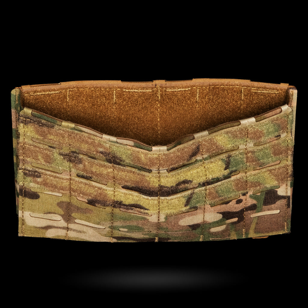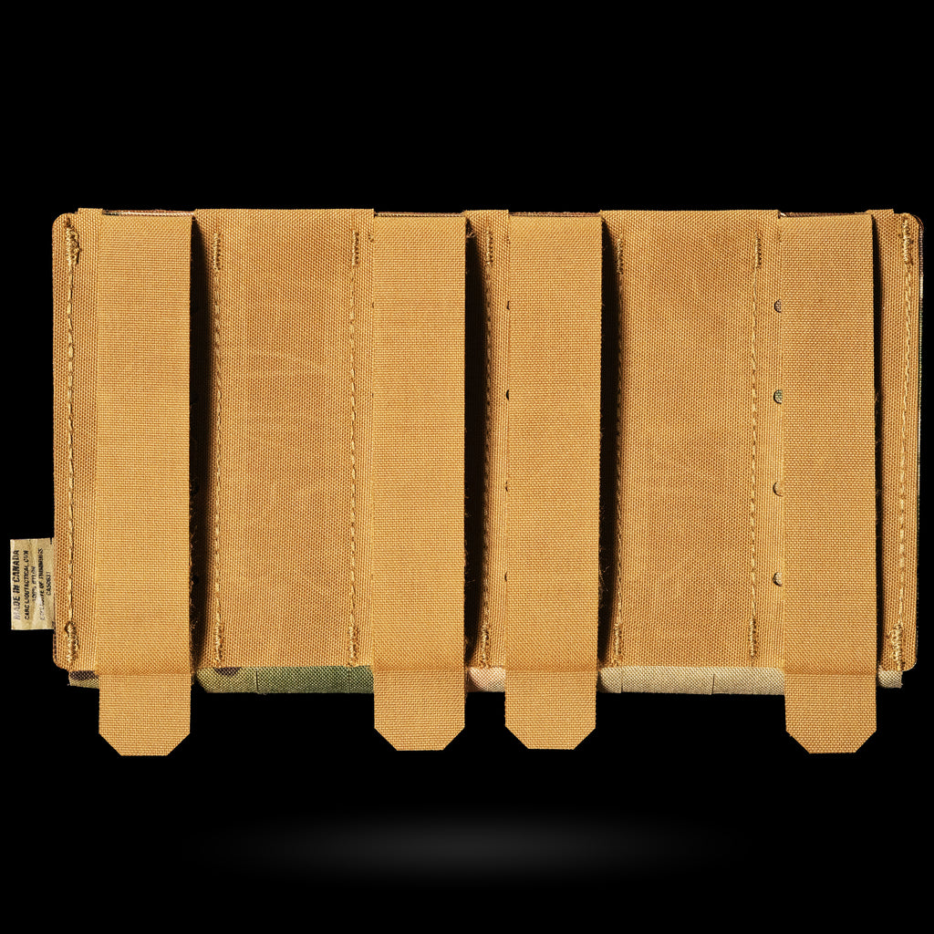 Le Mag Stack comporte une poche de style kangourou doublée de velcro doux (loop), pouvant accueillir nos inserts élastiques ou standards pour chargeurs. L’avant est également équipé de passants MOLLE/PALS pour ajouter des pochettes supplémentaires.