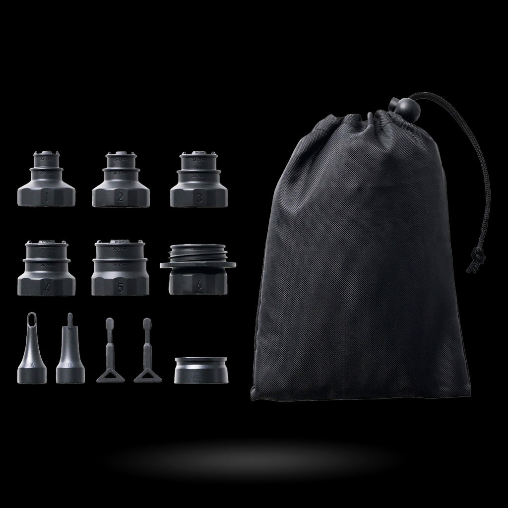 Includes eight numbered nozzles that fit a variety of valve types across air mattresses, sleeping pads, and pool floats. Each nozzle connects securely for hands-free use, refined after testing over 300 valve designs.