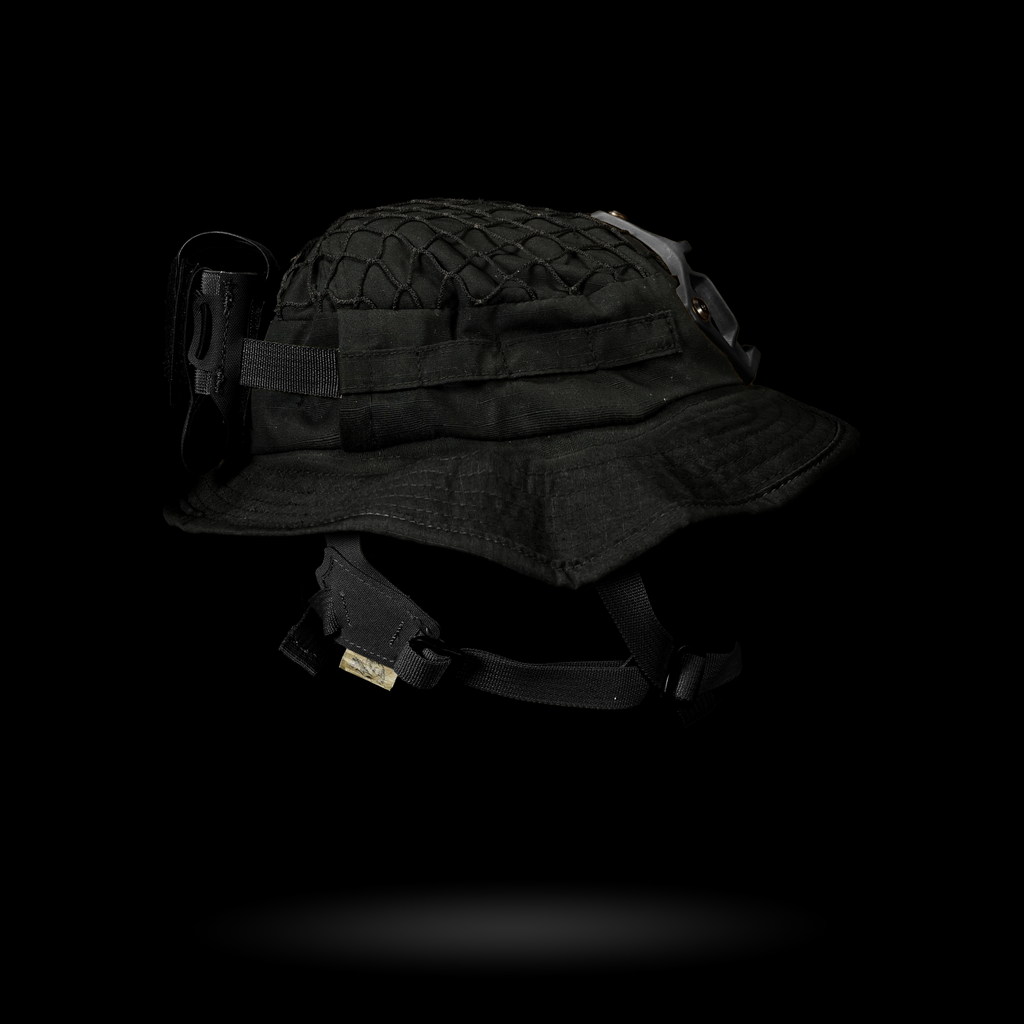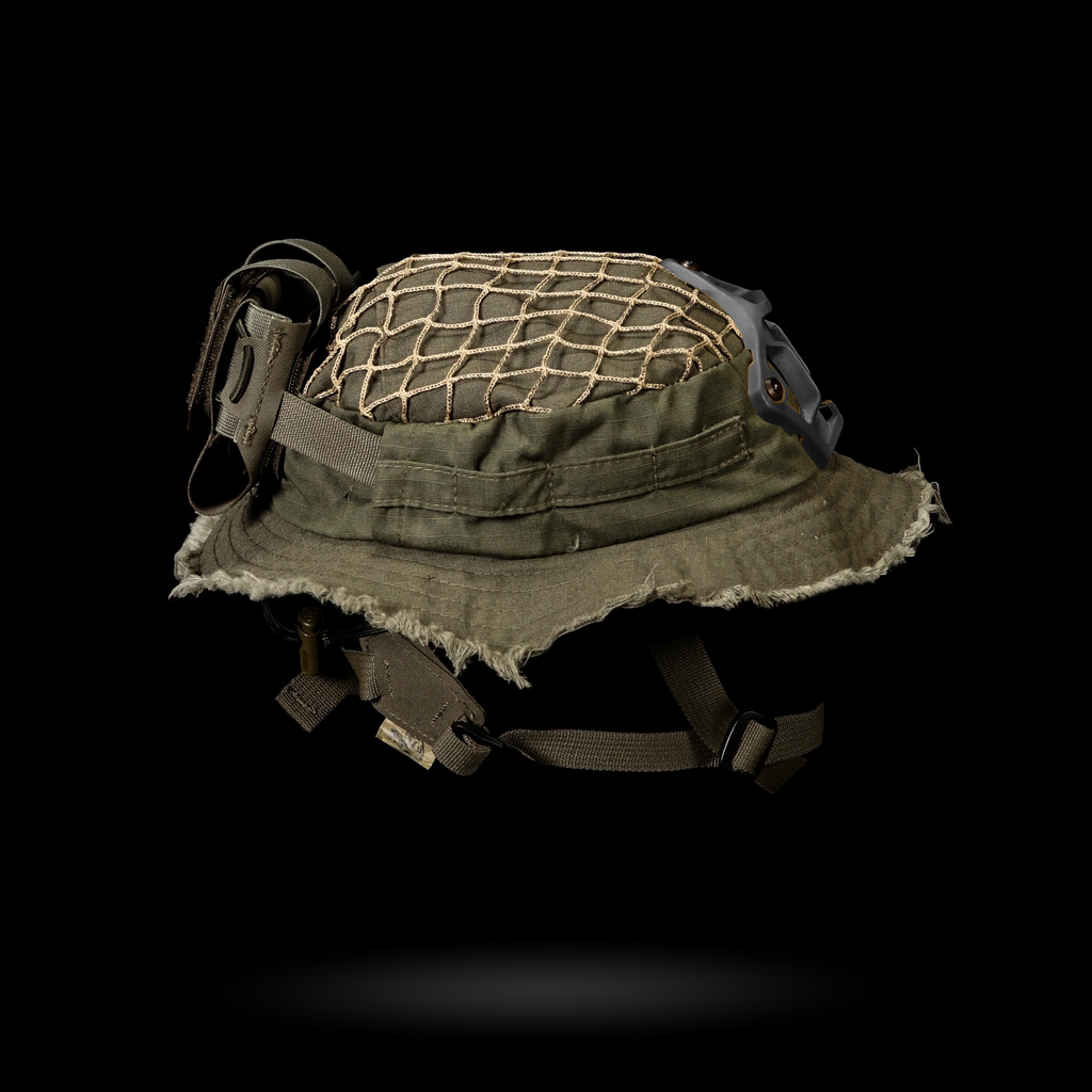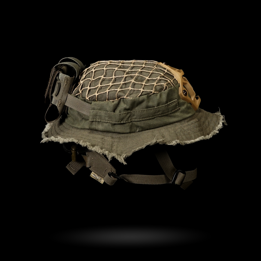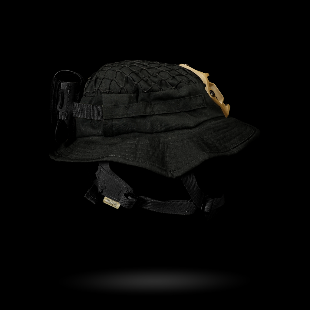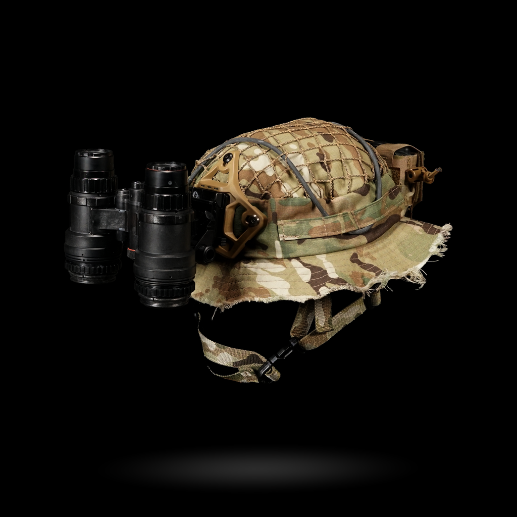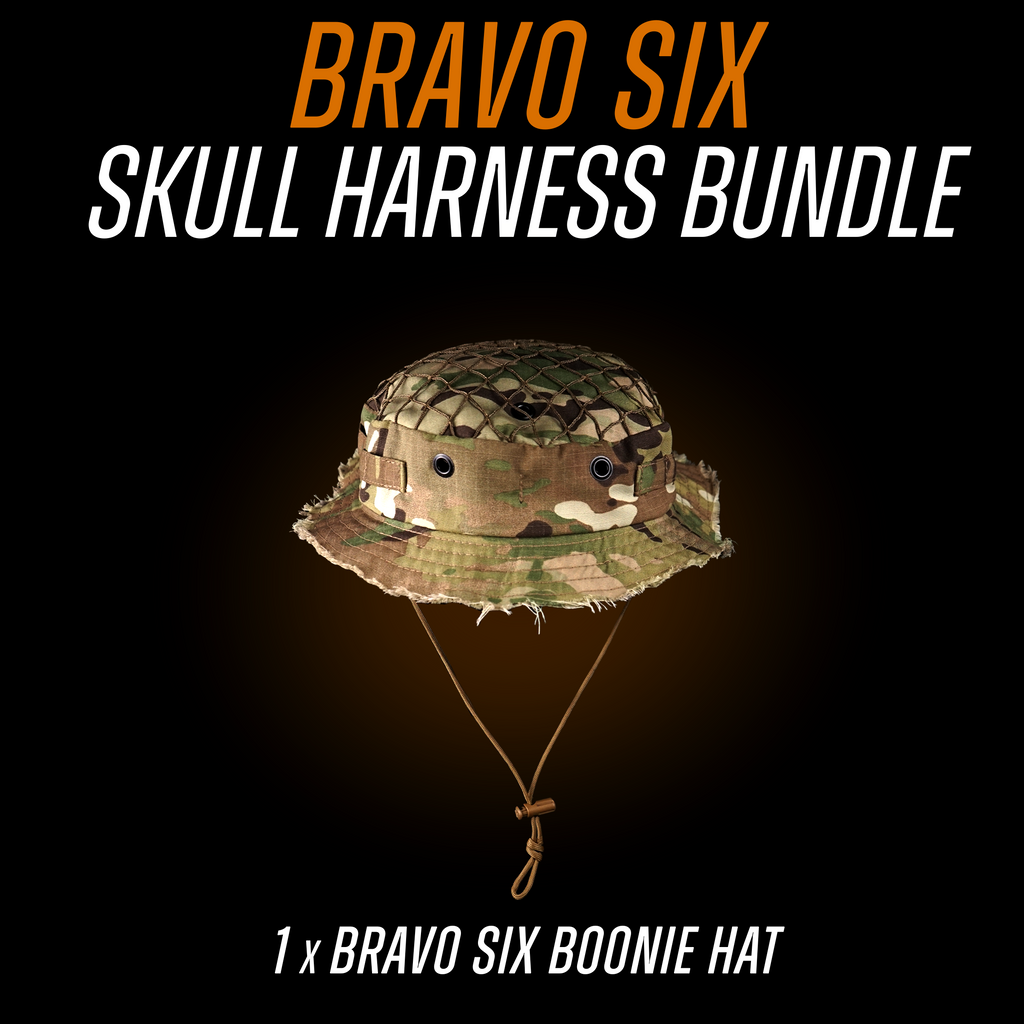 1x Chapeau Boonie "Bravo Six" : Cette housse de harnais est conçue avec plusieurs passants pour une intégration sans faille avec notre harnais crânien NVG, ainsi que des œillets pour fixer solidement un support NVG. La coupe large garantit la compatibilité avec divers harnais de tête.