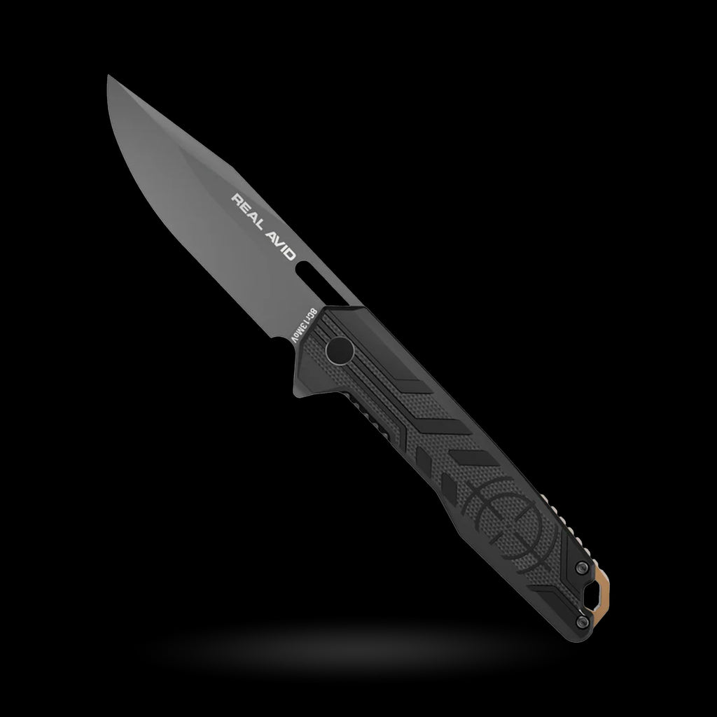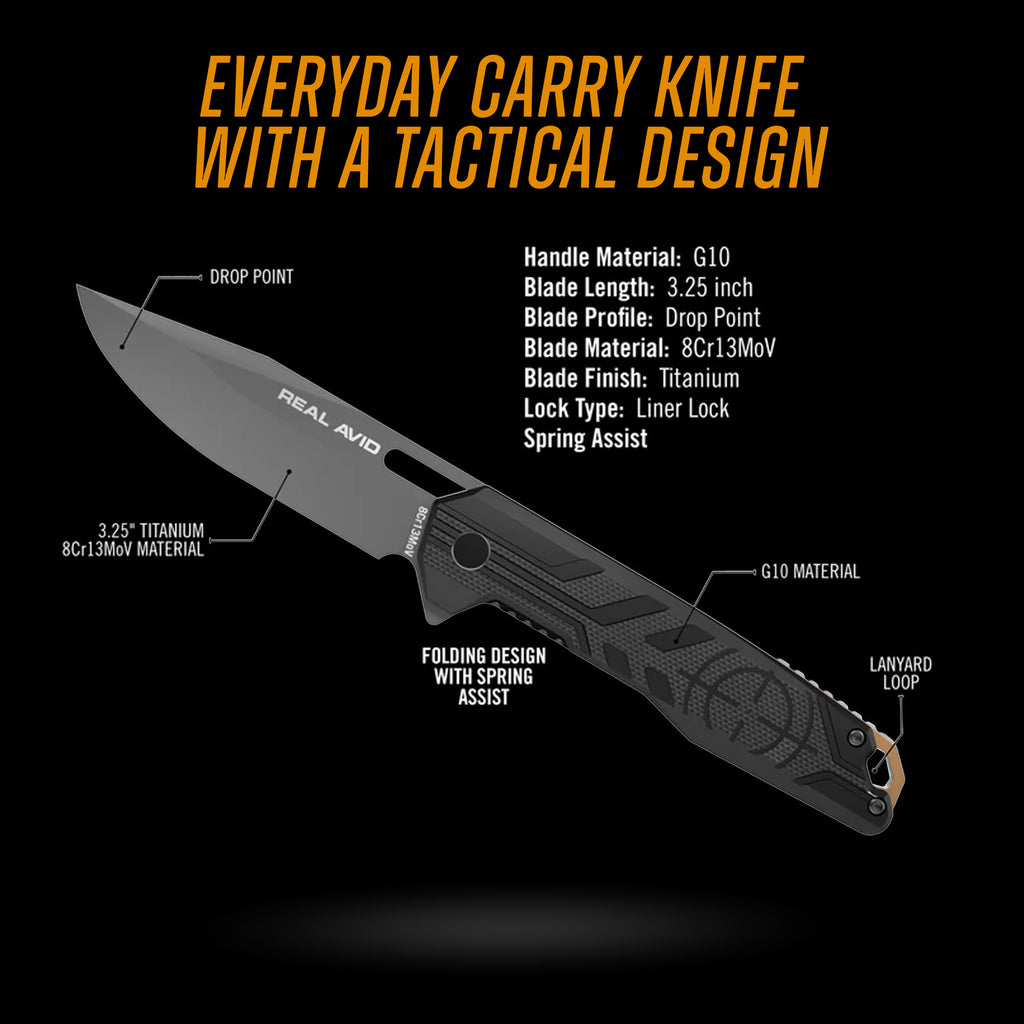 The RAV-7 from the Rav Series by Real Avid Blades. Built for readiness, this purpose-built carry knife features G10 handle material, paired with a 3.25-inch drop point blade made of 8Cr13MoV with a titanium finish, the RAV-7 is purpose-built for everyday carry. Equipped with a liner lock and spring assist mechanism, it ensures swift and secure deployment when needed. Born from a culture of readiness, Real Avid Blades are designed to confront life's toughest challenges head-on. With a commitment to proven real-world performance, RAV Series knives are more than just tools—they're a way of life. With a low-profile, deep carry pocket clip, the RAV-7 offers discreet accessibility for your everyday needs. Trust in the readiness of the RAV-7 by Real Avid Blades.