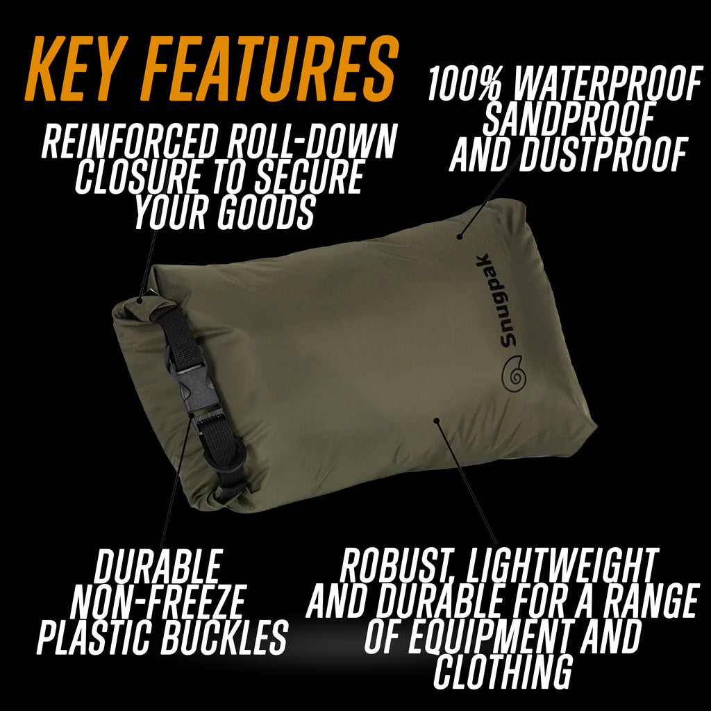 A performance dry bag that is 100% waterproof. A heavy duty storage bag with roll and clip seal to ensure contents stay dry, keeping your equipment safe from the elements as well as storing essential equipment in your pack. Tough ventures and inclement weather place extra demands on your kit, and there is nothing worse than finding equipment wet, or at worse damaged, when out on the hills. The Snugpak Dri-Sak™ is made from a robust lightweight nylon fabric and reinforced hem and buckle for roll-down waterproof enclosure.