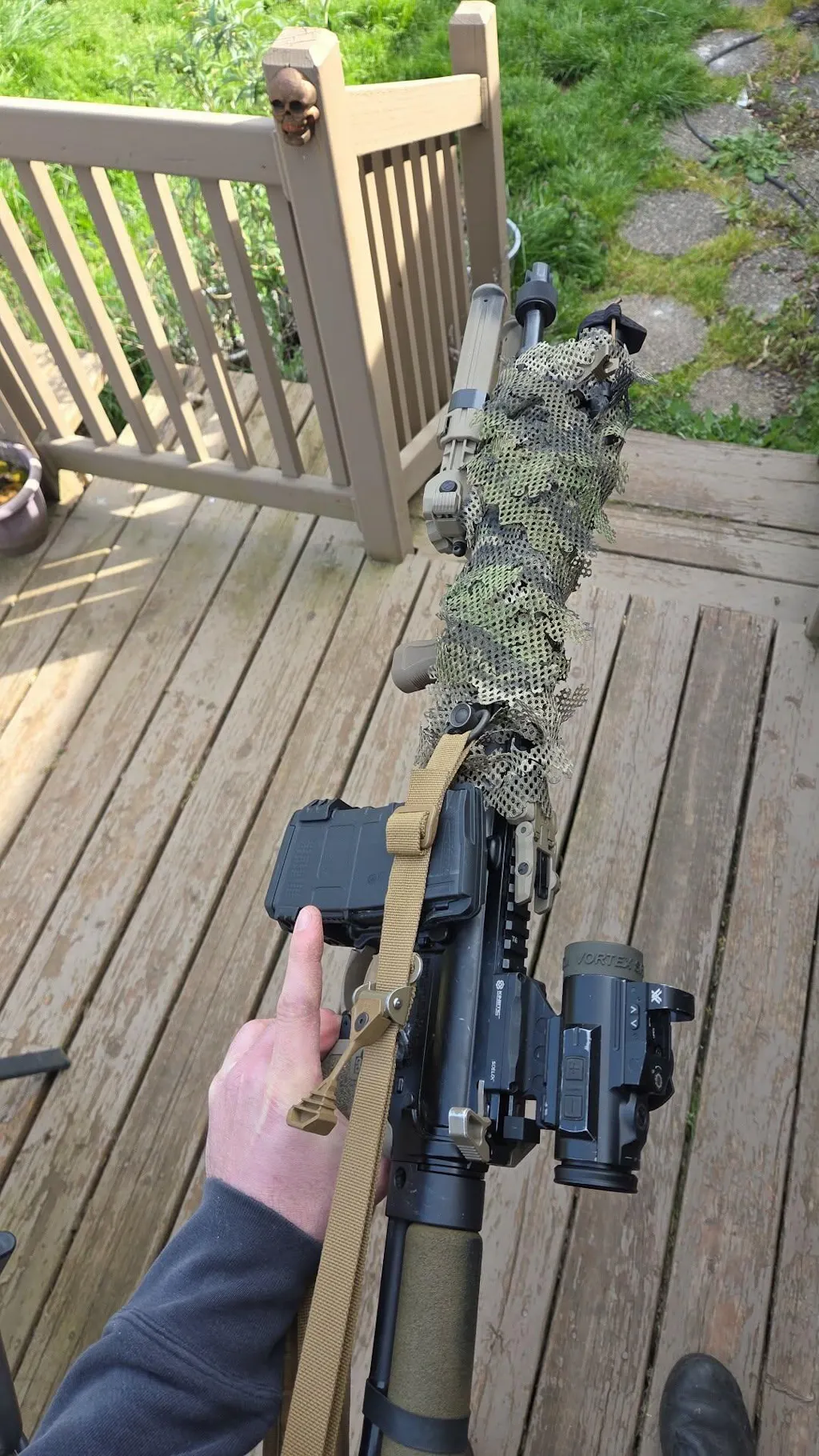 Git my rifle, spottwr, and 2 tripods decked out in the 3d wrap for hunting and helps your tools disapear into the brush with you